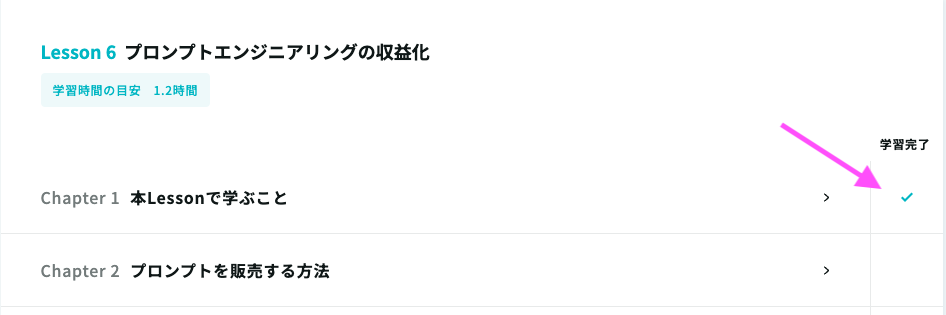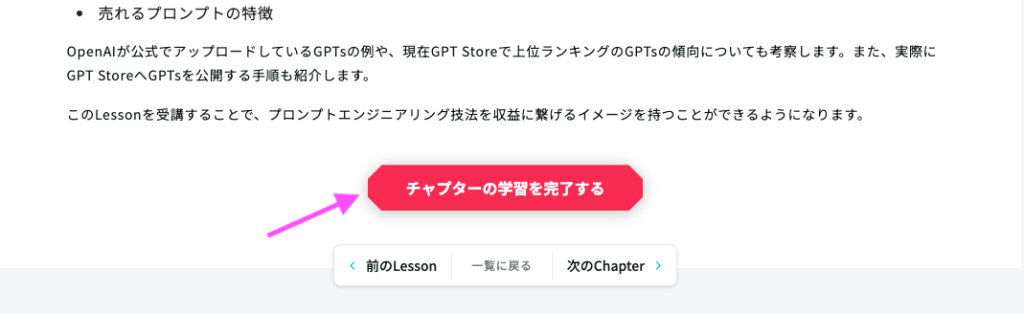 チャプターの学習が完了したら、「チャプターの学習を完了する」ボタンをクリックしてください。