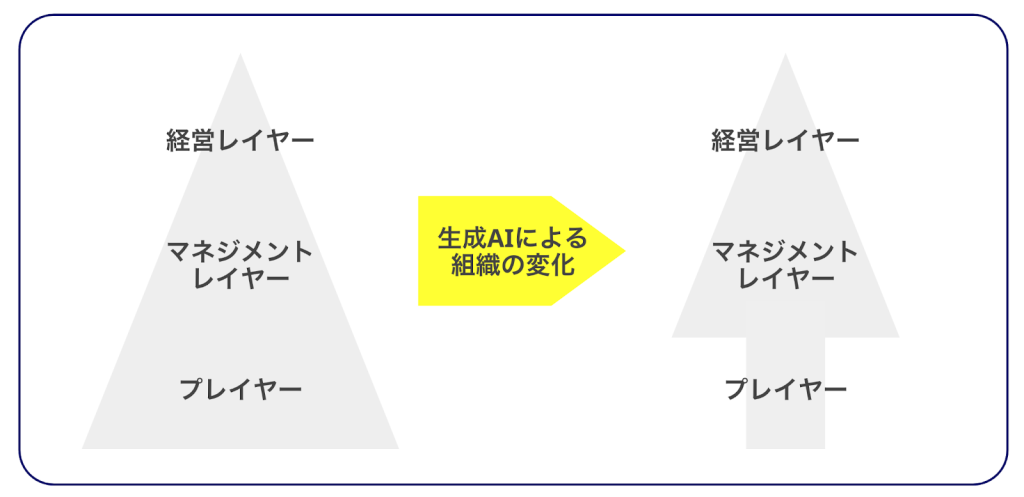 生成AIの進化はビジネスにおいて、様々なルーティンタスクやデータ分析がAIによって自動化されるようになるでしょう。従来の個々の作業を行うプレイヤーの重要性が低下し、全体の流れを見渡し管理するマネージャーの役割がより重要になり、会社のピラミッド構造がクリスマスツリーのような形に変化する可能性があります。