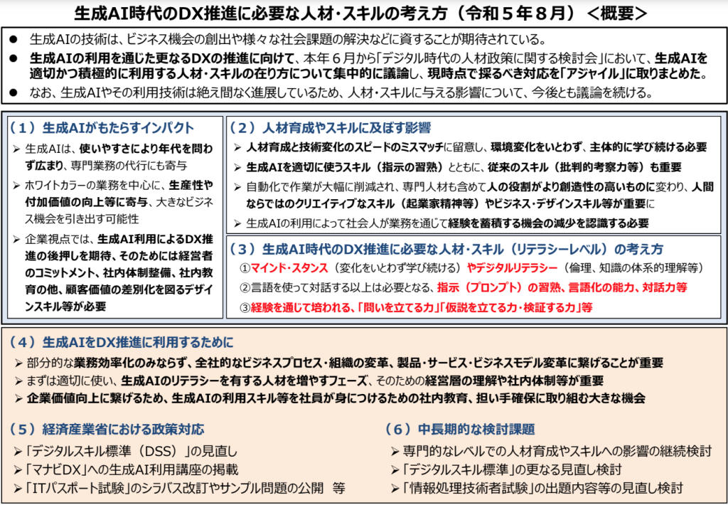 ソフトスキルの重要性については、経済産業省から発表された、「生成AI時代のDX推進に必要な人材・スキルの考え方」でも言及がされています。 出典:https://www.meti.go.jp/press/2023/08/20230807001/20230807001.html
