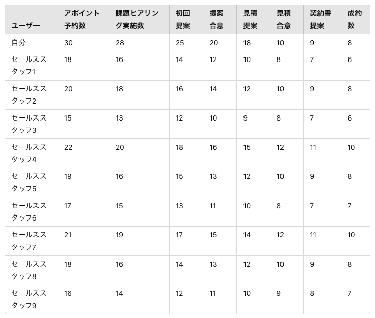 ユーザー(自分)のデータを他のセールススタッフと比較して分析します。