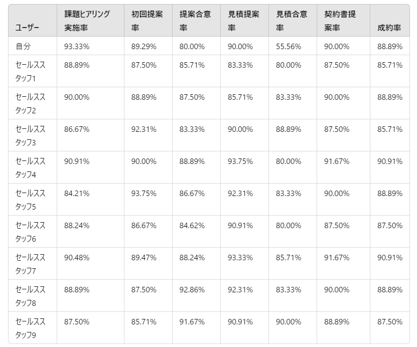 ユーザー(自分)は他のセールススタッフと比較して、見積合意率が低いことが課題です(55.56%)。見積提案から見積合意への移行がスムーズに進んでいない可能性があります。